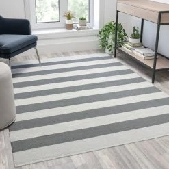 Long lasting comfort paired with a budget-friendly price point make this indoor/outdoor grey and white striped cabana style area rug ideal for busy families. The neutral palette blends beautifully with your indoor furniture or deck or patio set to instantly transform the look of your space. Strong synthetic handwoven polypropylene fibers can absorb water without growing mold or mildew and are ideal for high moisture areas such as kitchens, bathrooms, entryways and decks. Use this rug under your poolside furniture to prevent contact with hot walking surfaces while you relax.