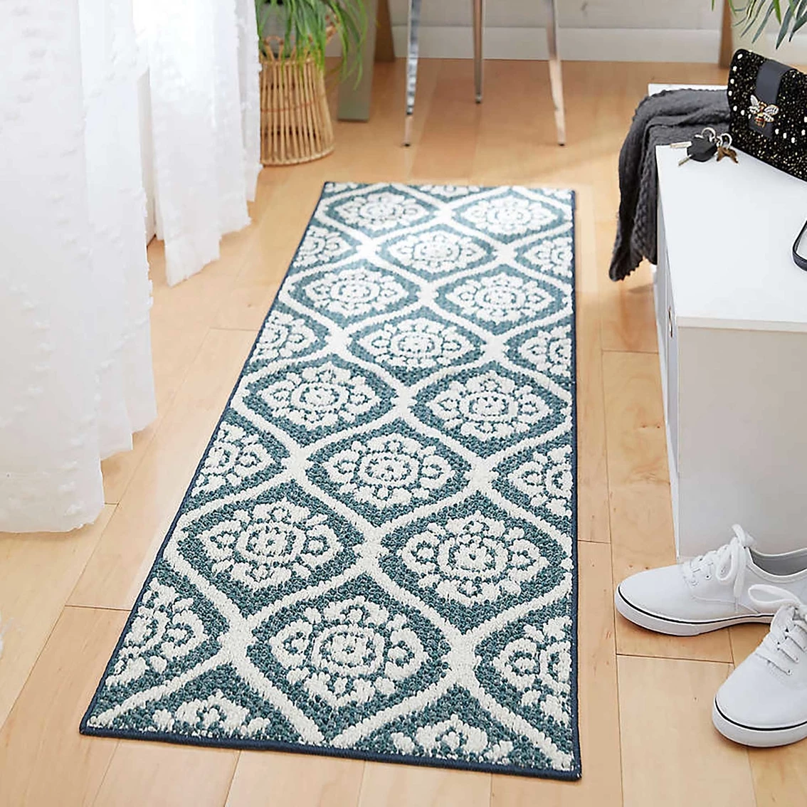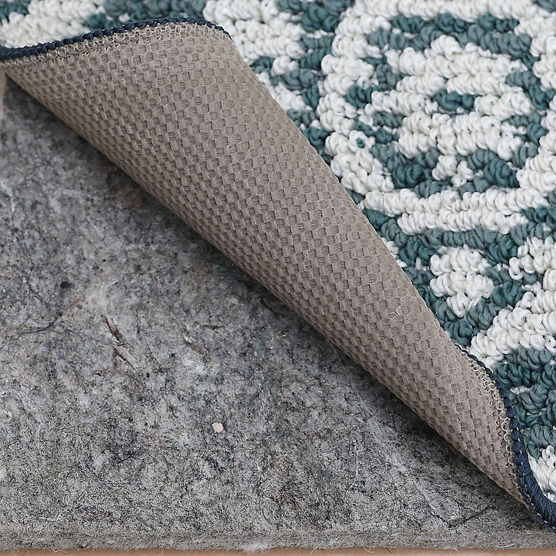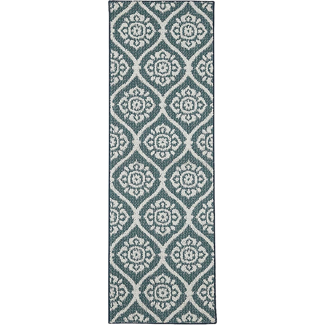 This Mohawk Home Junius Medallion rug features teal, cream and denim tones. This stain resistant rug will beautifully accent your space. Model: 086093675905.