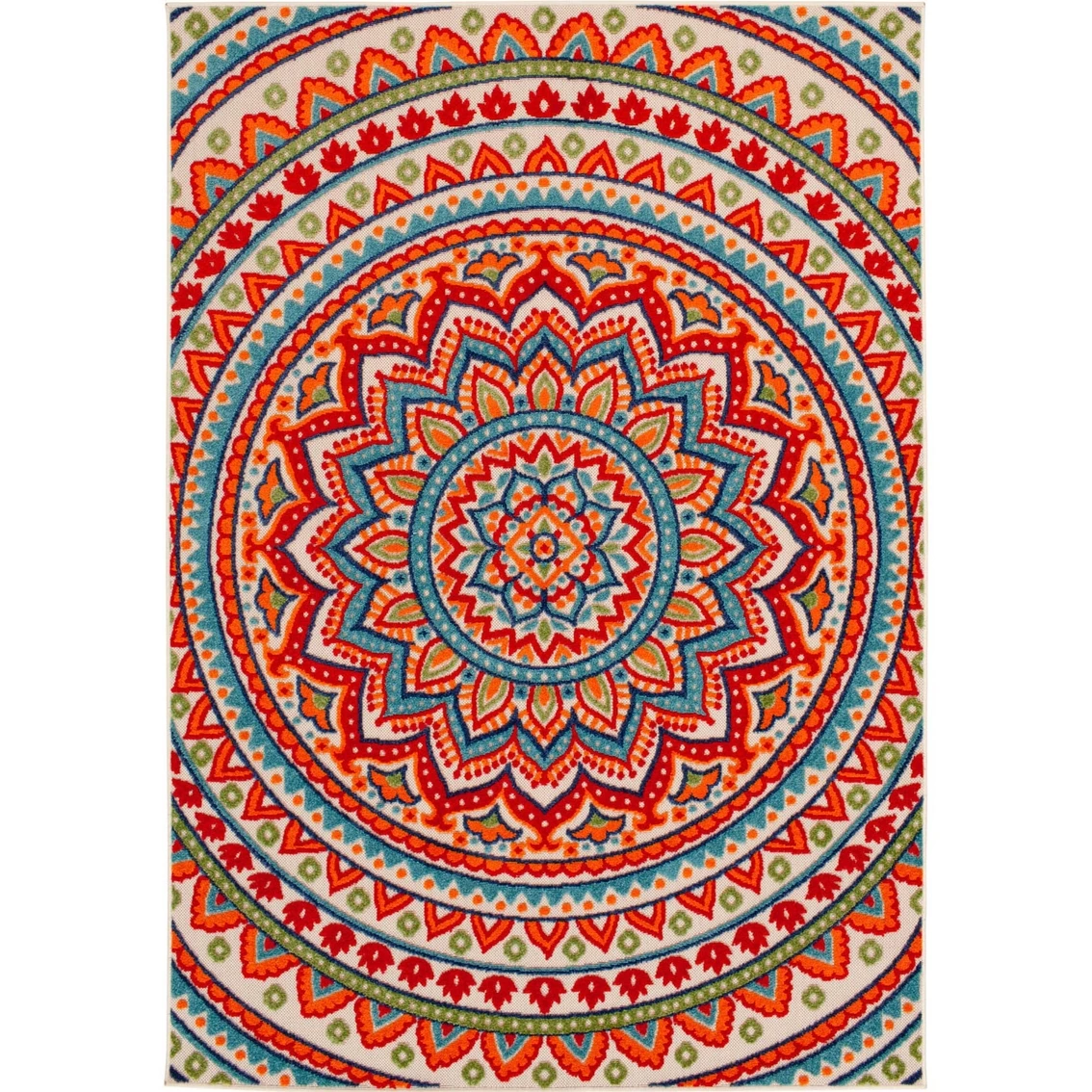The beautiful medallion design of this durable Natco Home Fortune Collection Panyin Area Rug is bursting with bright color and is perfect for livening up your deck, kitchen, or mudroom. Ornate designs in vivid color create a compelling visual effect, and the unique high-low weaving technique adds texture and dimension to your space. Whether it’s a quiet spot in the sun or a busy central dining area, this floor covering lets you infuse a bit of low maintenance, high-end design into your home without fear of staining or fading, even in high-traffic and spill-prone areas. These gorgeous floor coverings are fade resistant, stain resistant, and surprisingly comfortable underfoot thanks to soft polypropylene yarns, so you can spend more time enjoying your space and less time on maintenance. Easy to clean and machine made using state-of-the-art, computer-driven looms, these rugs are sure to maintain their exceptional durability and rich design for years to come. For indoor or outdoor use. Imported. Model: 1657.04.51EC.