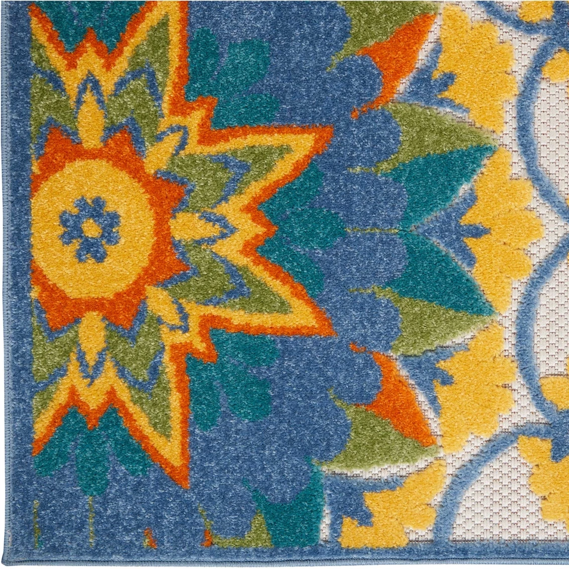 Beautifully bold and texturally rich, this floral indoor/outdoor area rug from Nourison’s Aloha Collection lends a warm and sunny vibe to your porch or patio. Its high-low styled weave is crafted in vivid shades of blue, yellow, orange and green on a classic white background. Premium stain resistant fibers offer durability and ease of cleaning — simply rinse with a hose and let it air dry! Model: 42620.