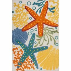 Roll out your own little slice of the beach life with this coastal indoor/outdoor area rug from the Aloha Collection. Breezy starfish, sea shells, and undersea bubbles woven in cool grey, blue, white, and ivory tones set a foundation for relaxation on your patio, deck, or anywhere inside your home. Expertly machine made of premium, stain resistant fibers, this Aloha area rug from Nourison offers durability and ease of cleaning — just rinse with a hose and air dry! Model: 42620910.