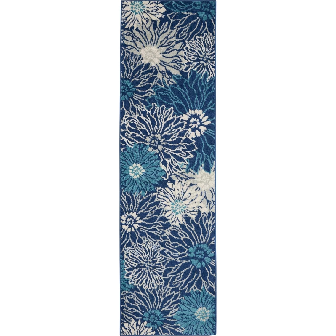 Fabulous oversized florals capture the Wow! factor in this Nourison Passion Area Rug. Its contemporary flair features a palette of soft charcoal and ivory, enlivened with touches of bright turquoise blue. Soft and inviting, it’s the ideal expression of modern comfort in any room. Measures 2 ft. 2 in. x 7 ft. 6 in. Model: 42620910.