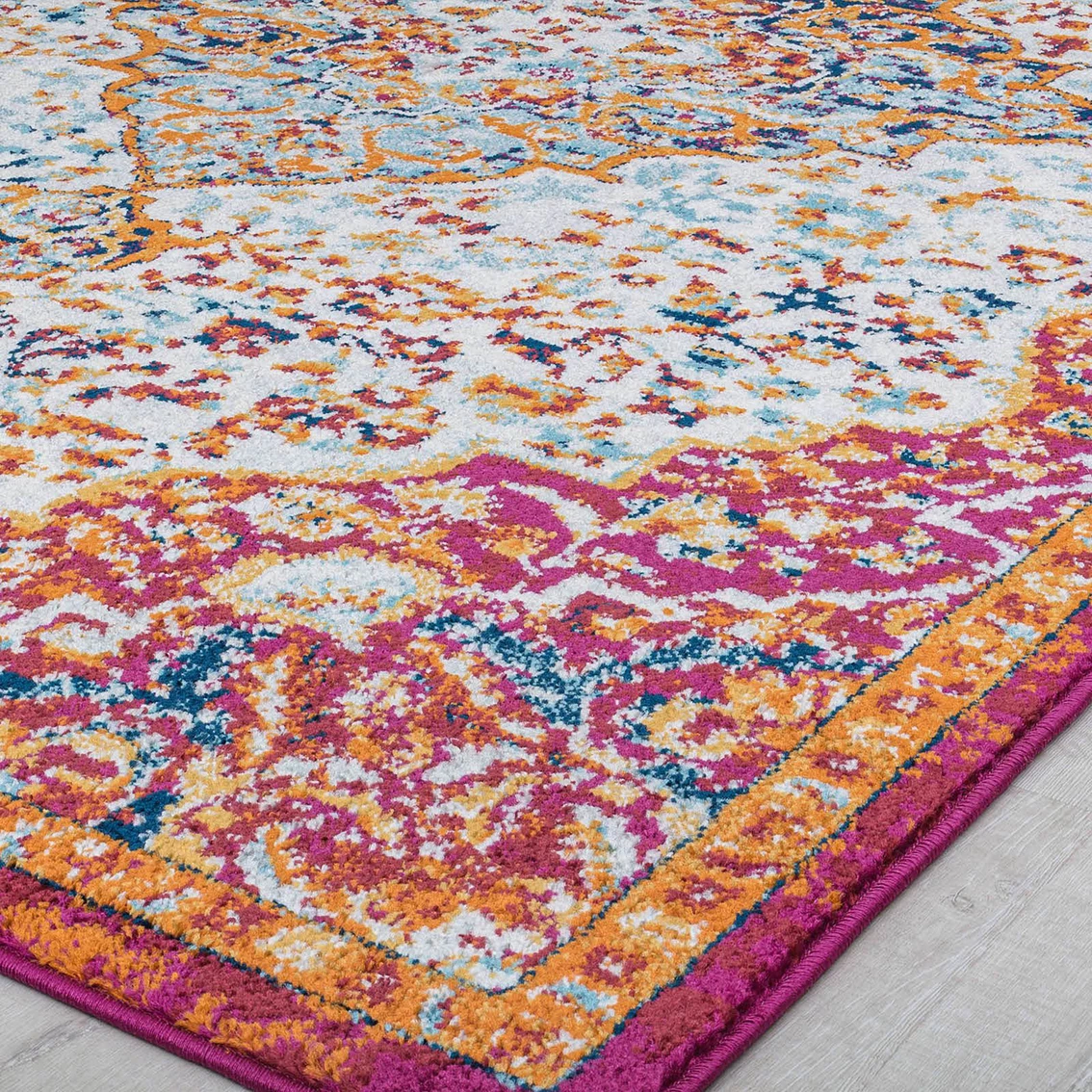 The lovely Amelia Blush runner rug from Rugs America features the artfully nuanced juxtaposition of a lacy, almost icy, medallion with a striking fiery composition, dotted with magenta, orange and deep blue. Featuring one of Rugs America’s brightest, eye-catching color palettes and a beautifully ornate carpet design, this rug is guaranteed to take center stage in your room. Its flamboyant essence is best complemented by robust furnishings that feature wooden accents for a retro, bohemian look or leather accents for an eccentric, kitschy style. Model: 793530309469.
