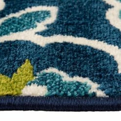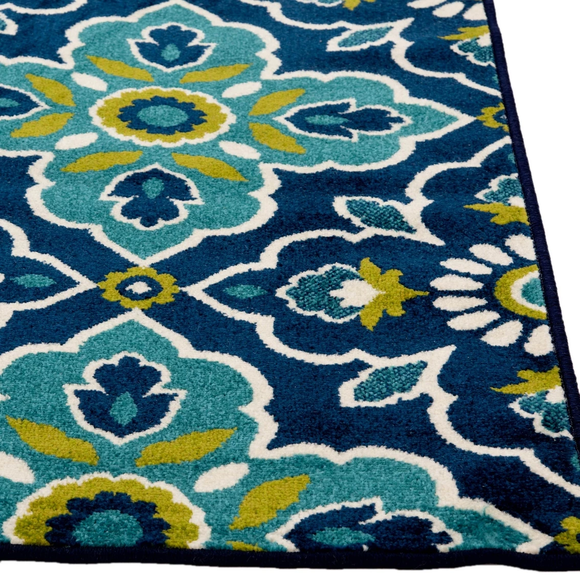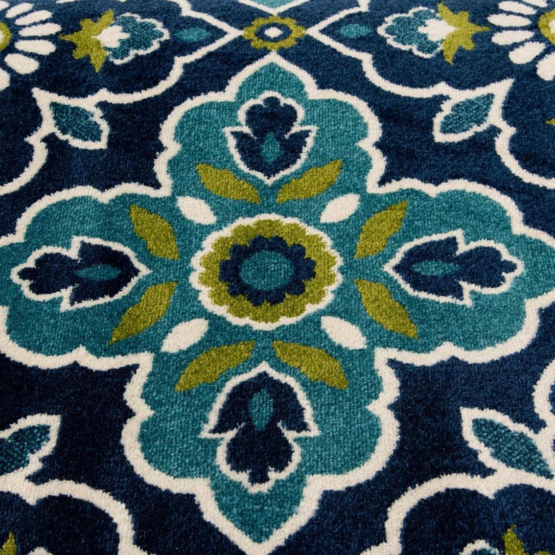 It’s all about vivid color in this versatile area rug from Trisha Yearwood, perfect for brightening up your dining room, bedroom or den. If you’re looking for a sophisticated yet fun piece to complete the look of your space, this beautifully woven area rug is exactly what you need. Bright color and ornate design combine to create an eye-catching and elegant addition to any room, with intricate ivory, lime green and teal designs across a deep navy blue background. Each rug is machine made using state-of-the-art, computer-driven looms, and the low profile pile of super-soft polypropylene yarn allows you to enjoy high-end design without sacrificing comfort or durability. Perfect for a wide range of decor styles, this beautifully woven area rug will do well in any area of your home — even places with high traffic and spill risk. In addition to being easy to clean, the stain resistant and fade resistant properties of this piece ensure that it will maintain its appearance for years to come. For indoor and outdoor use. Made in the USA. Model: 2335SQ58.
