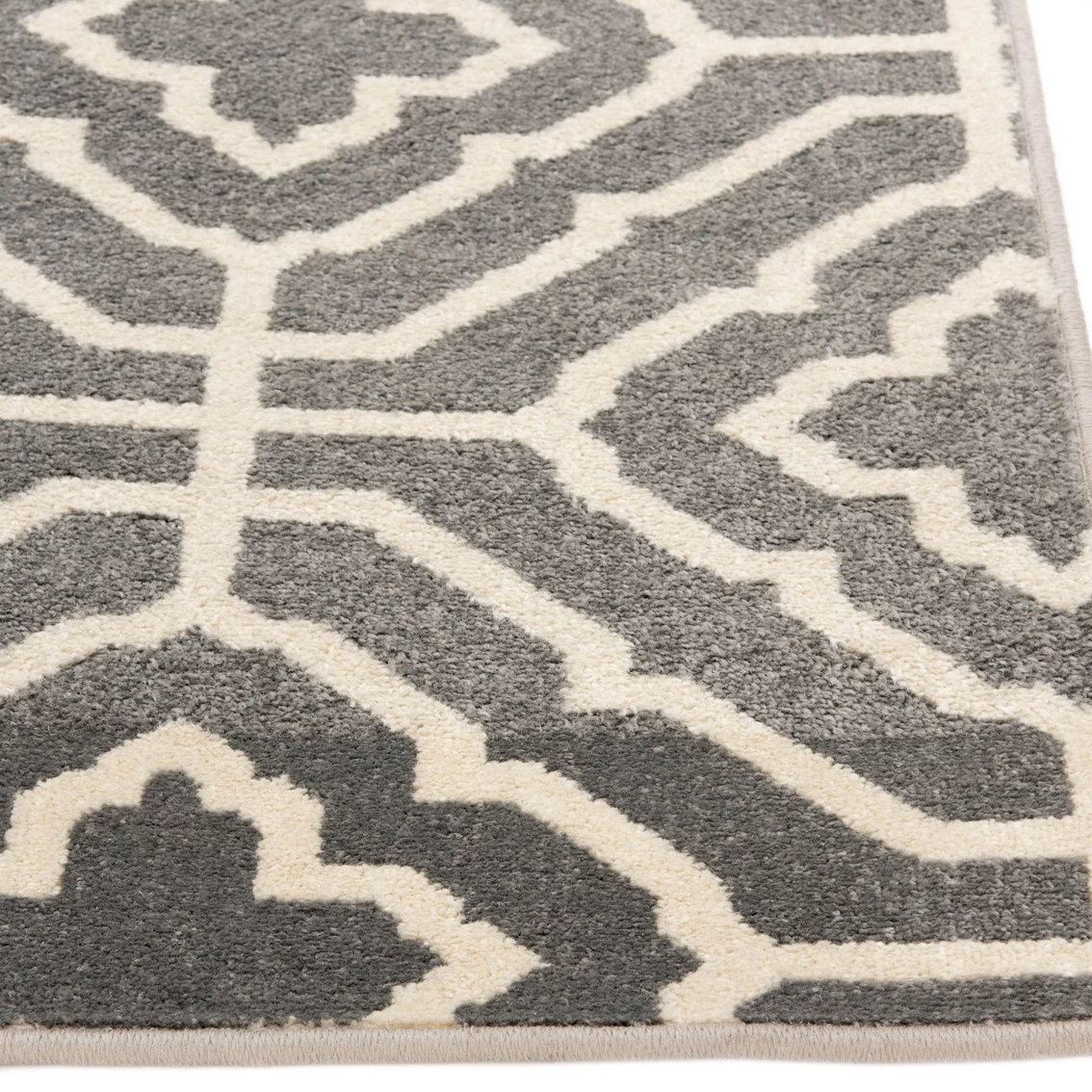 With a modern look and versatile color palette, this beautifully woven area rug from Trisha Yearwood has just what you need to jazz up your living room, dining room or bedroom. Whether it fits your home’s existing style of decor or you’re looking for a style refresh, this piece has a perfect balance of contemporary simplicity and lively design. Intricate linear designs in crisp ivory stretch across a charcoal gray background, adding a simply sophisticated touch to your lively play area or quiet office space. Each rug is machine made using state-of-the-art, computer-driven looms, and the low profile pile of super-soft polypropylene yarn allows you to enjoy high-end design without sacrificing comfort or durability. Perfect for a wide range of decor styles, this beautifully woven area rug will do well in any area of your home — even places with high traffic and spill risk. In addition to being easy to clean, the stain resistant and fade resistant properties of this piece ensure that it will maintain its appearance for years to come. For indoor and outdoor use. Made in the USA. Model: 2331TW58.