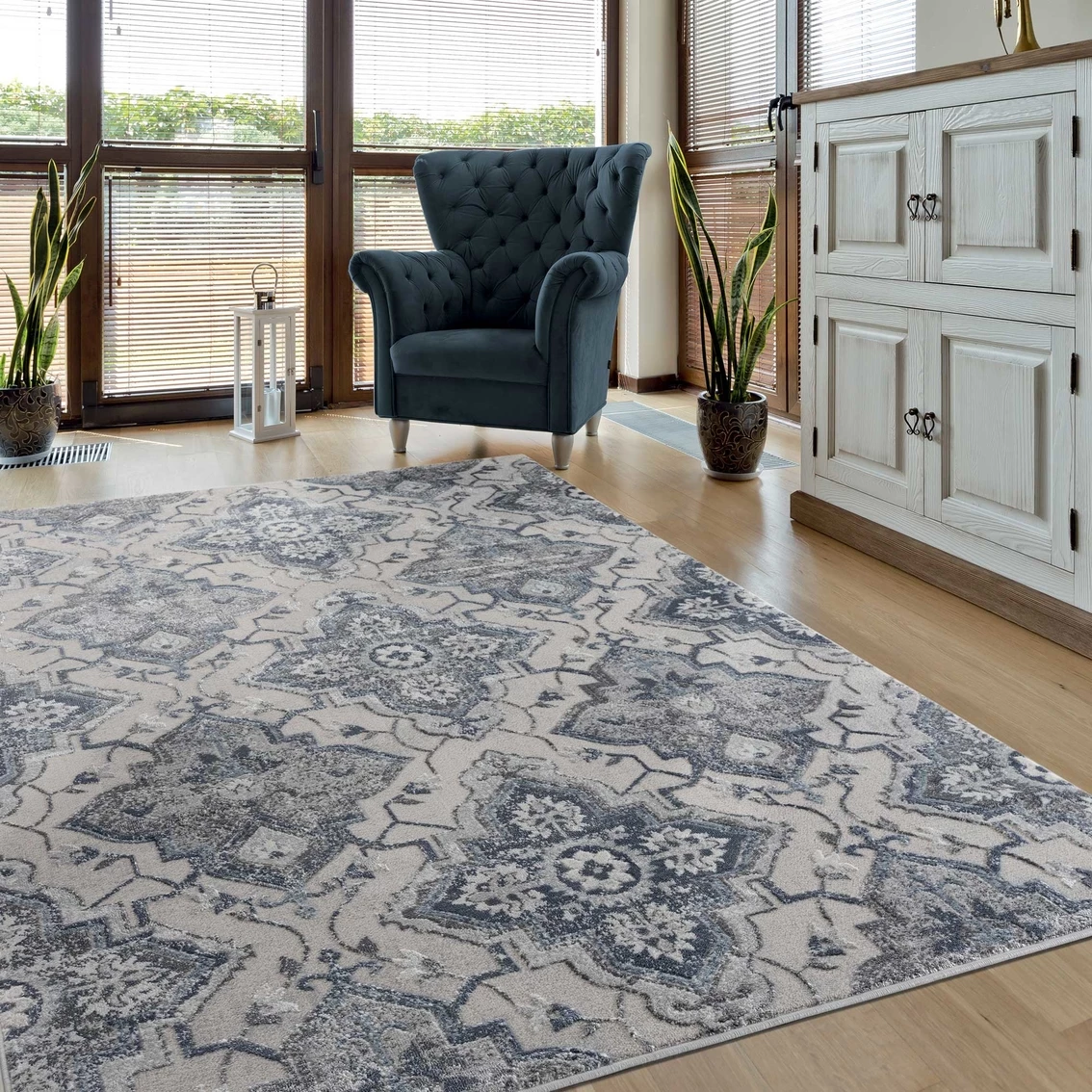 Enrich your room decor with this exquisitely designed transitional Cascades Leavenworth Rug from United Weavers. Beautiful and ornate distressed pattern and faded blue tones will add a stylish allure to your home decor. Rug is proficiently machine woven in Turkey using the finest olefin and polyester yarn with jute backing for a long-lasting look and appeal.